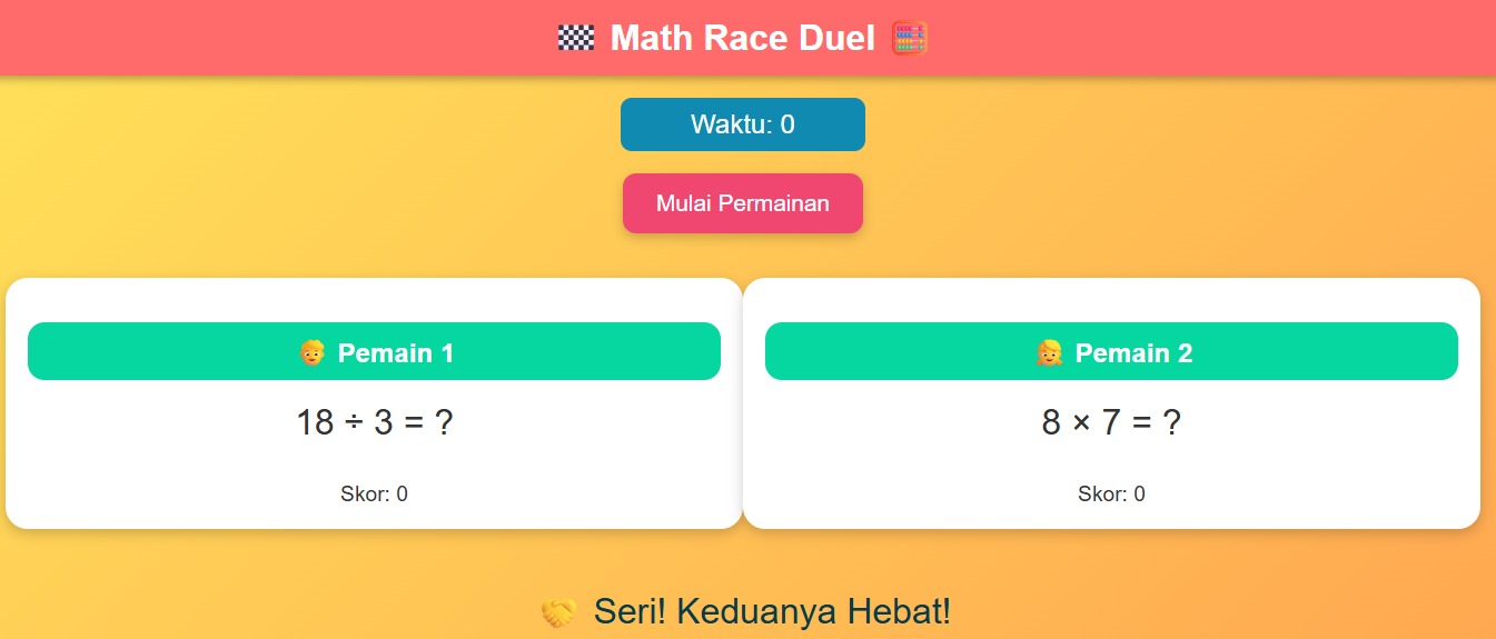 Math Race Duel adalah game edukasi interaktif berbasis Smart Board dan web yang dirancang untuk melatih kecepatan serta ketepatan berhitung